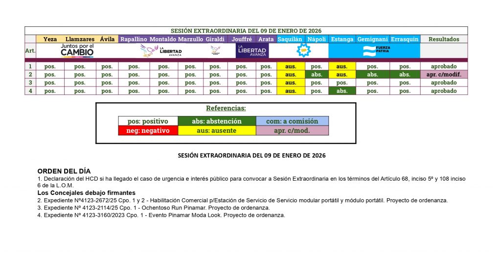 Pinamar 09 de enero del 2026.- Siendo las 10:07 hs. se da inicio a la primera sesión del año, con la excusación de la concejal Saquilan, por lo que estuvo ausente en la misma.